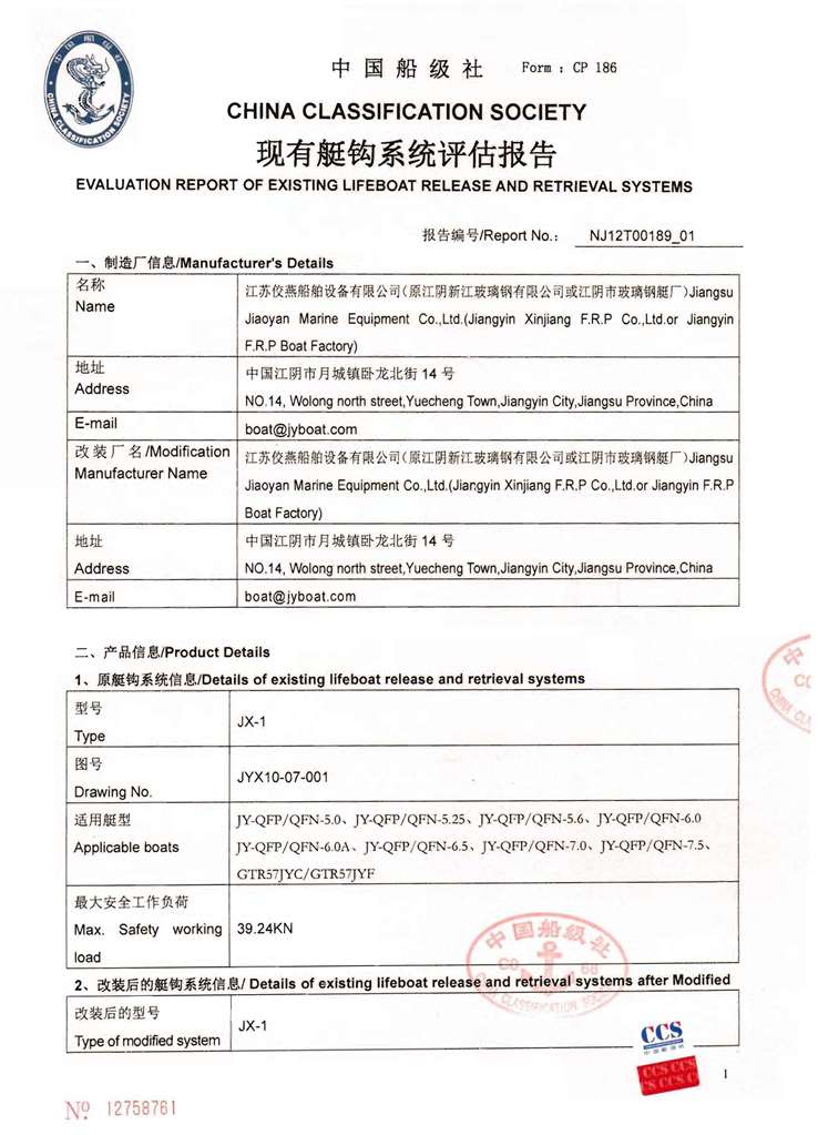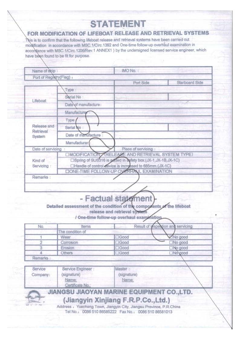 近期,发现国内存在一些服务公司为牟取私利,置船员生命安全于不顾,未经我公司专业培训和认可,擅自对我公司(荣耀体育官方网站/江阴新江玻璃钢有限公司)生产的救生艇设备进行救生艇吊钩改造,同时签发伪造的声明,因此引起了重大的安全事故.重要提示:荣耀体育官方网站(江阴新江玻璃钢有限公司)对一切未经本公司专业培训和认可的服务商提供的对本公司产品的所有服务不承担任何责任,并保留对其追究法律责任的权利.